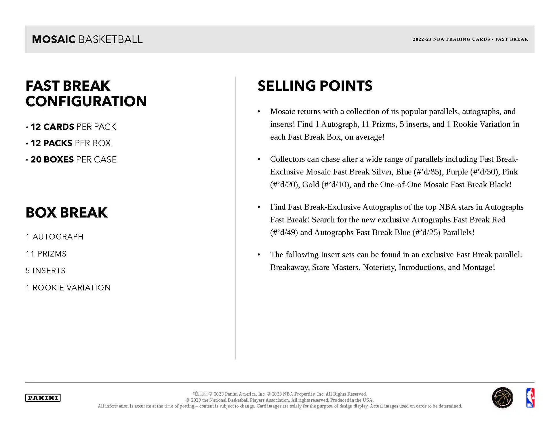 2022-23 Panini Mosaic Fast Break NBA Basketball Cards Cards PRODUCT HIGHLIGHTS: