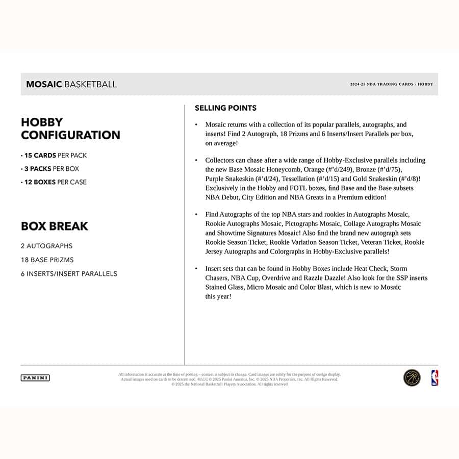 2024-25 Panini Mosaic NBA Basketball Cards Cards PRODUCT HIGHLIGHTS: