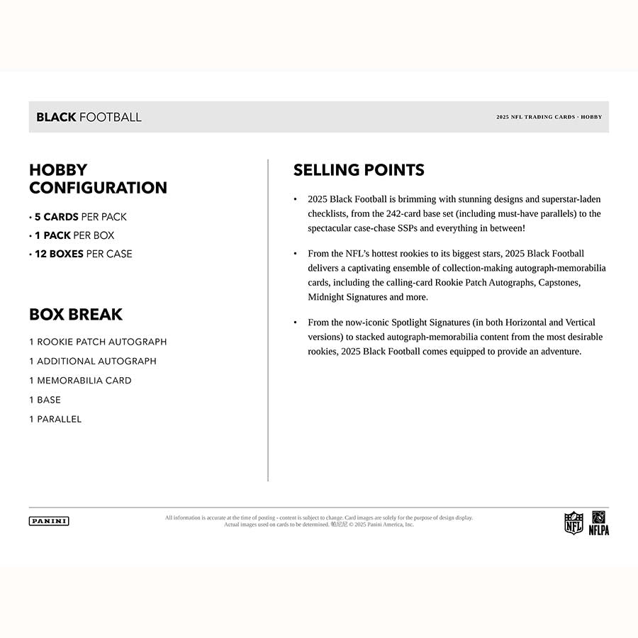 - From the now-iconic Spotlight Signatures (featuring both Horizontal and Vertical versions) to stacked autograph-memorabilia content from the most desirable rookies, 2025 Black Football comes equipped to provide an absolute thrill-seeking adventure.
