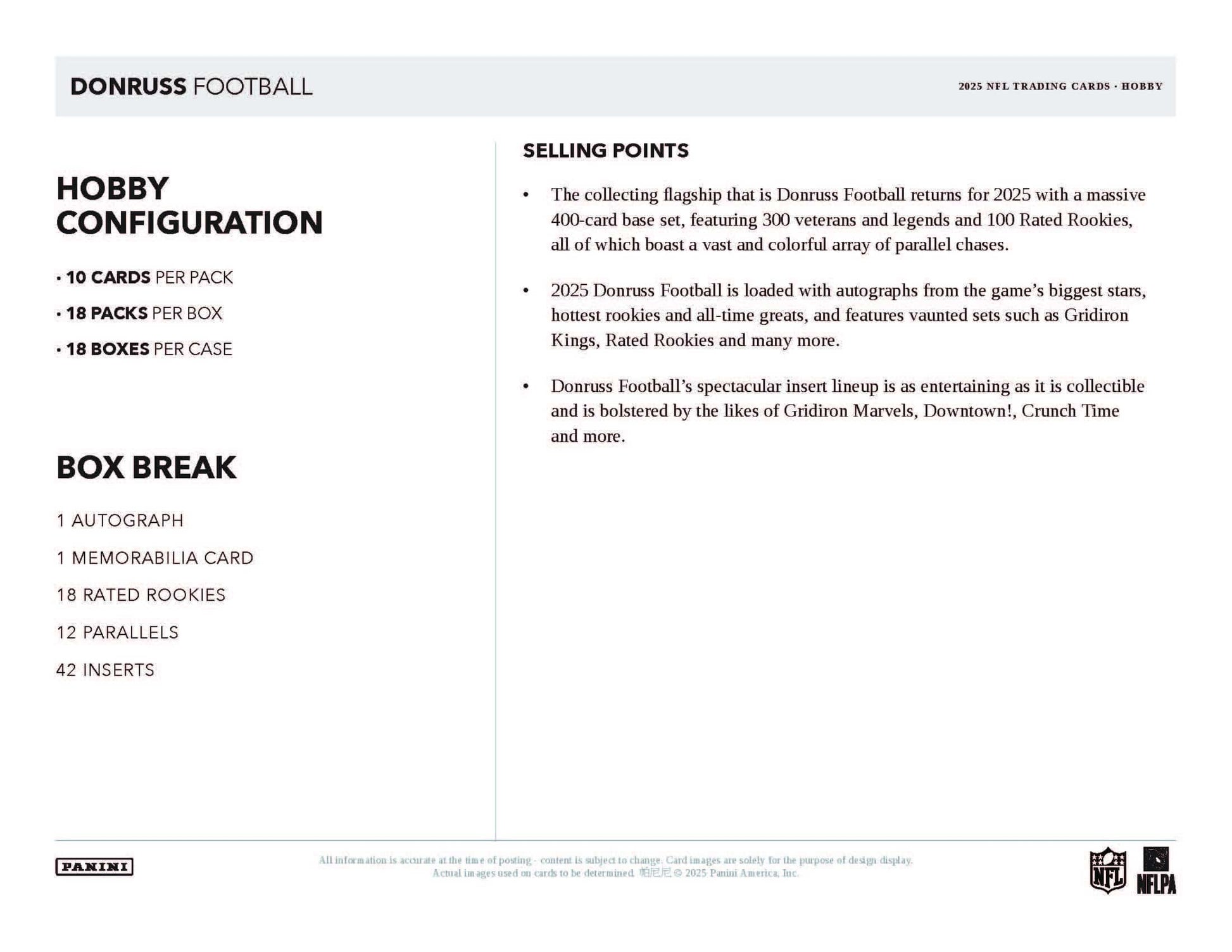 - 2025 Donruss Football is LOADED with autographs from the game’s biggest stars, hottest rookies and all-time greats, and features vaunted sets such as Gridiron Kings, Rated Rookies and many more.