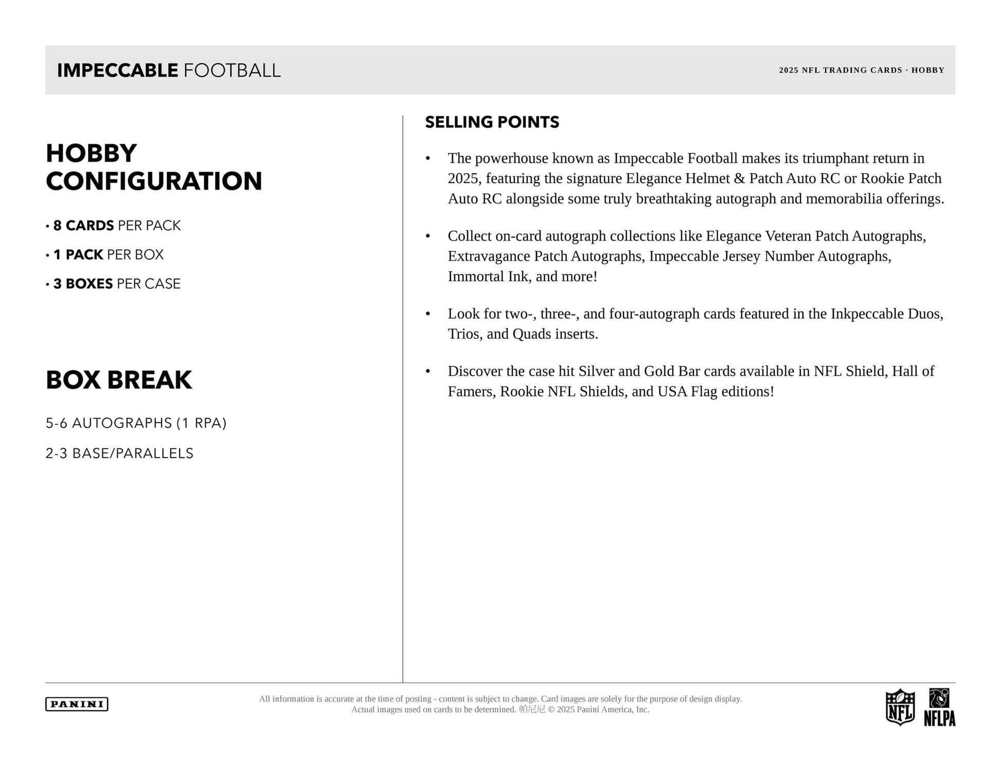- 2025 Impeccable Football features the biggest Hall of Famers, top superstars in the league today and the biggest stars of tomorrow from the 2025 NFL Draft!